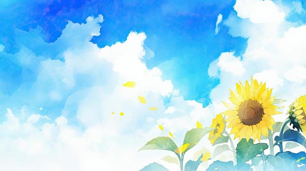 ヒマワリと青空の水彩画