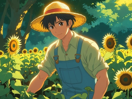 ひまわり畑で働く若い青年