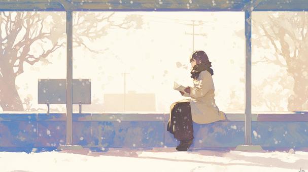 雪待つ駅の読書する少女