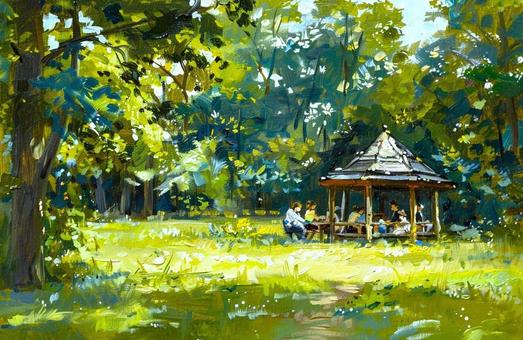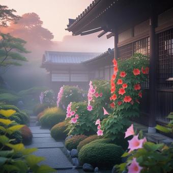 瑞々しい緑の森に佇む木造和風建築_背景画