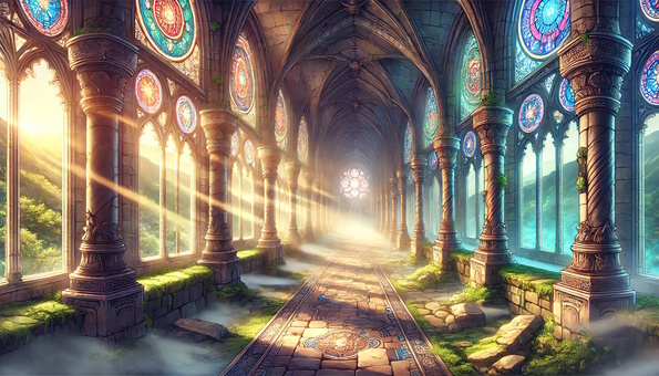 古い修道院の重厚な廊下に射す光芒_背景画