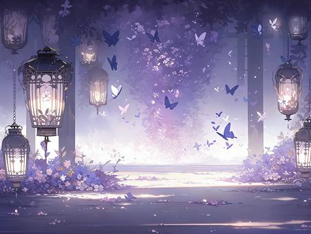 ランタンの灯る蝶舞う幻想的な庭園_背景画