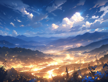 流星の飛来する夕空と煌めく大地と湖_背景