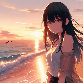 夕日の沈む海と女子高校生