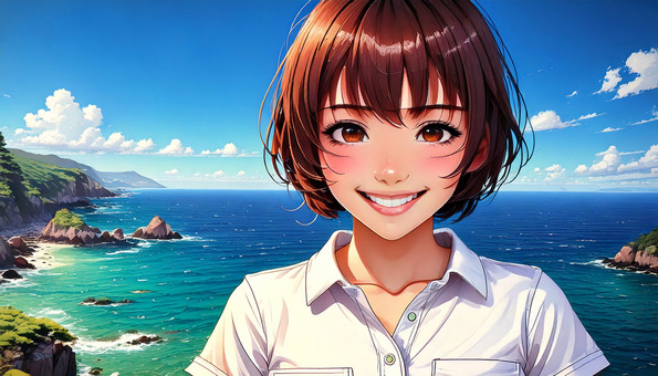 夏のビーチと笑顔の女性_1