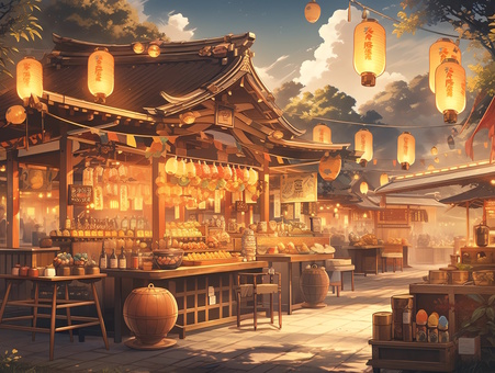 神社のお祭りの日の夜店と提灯飾り_背景画