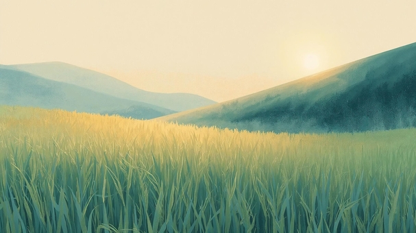 淡くのどかな草と山の風景