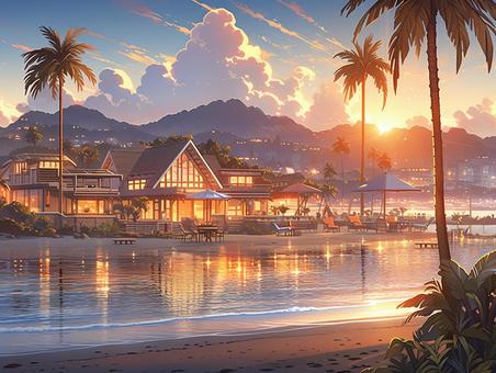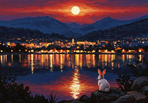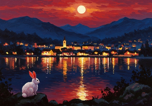 宵闇の薄紫色に包まれた湖畔の城と町_背景