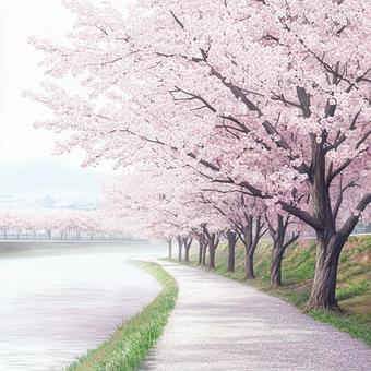 堤防沿いに咲いた満開の桜並木の絵画素材
