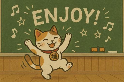 黒板の前で喜ぶ猫