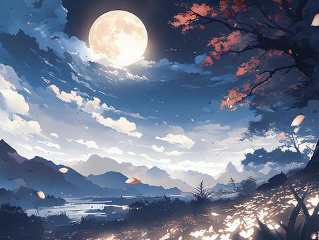 風光明媚な満月の夜の花々と川と山脈_背景