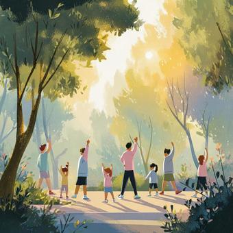 家族と子どもが朝の体操をするイラスト