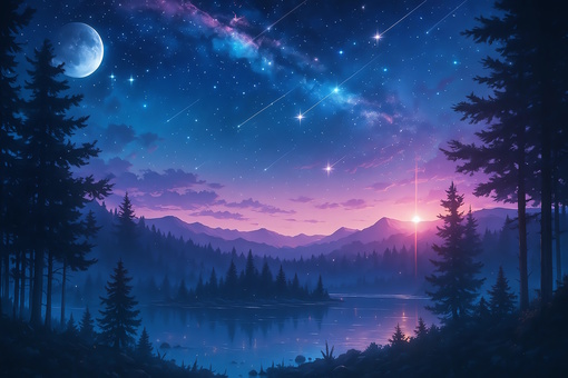 夜空を映す幻想的な湖と針葉樹の森_背景画