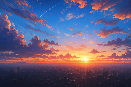 都市の空を彩る鮮やかな夕焼けと茜雲_背景