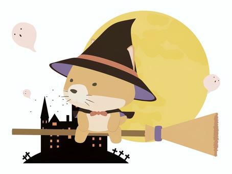 ほうきに乗って飛ぶ魔女姿の茶色い犬