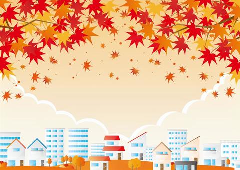 夕暮れの秋の紅葉と街のイラスト風景