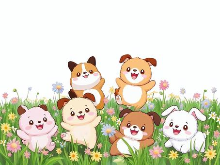 花の中で楽しそうにしているたくさんの動物