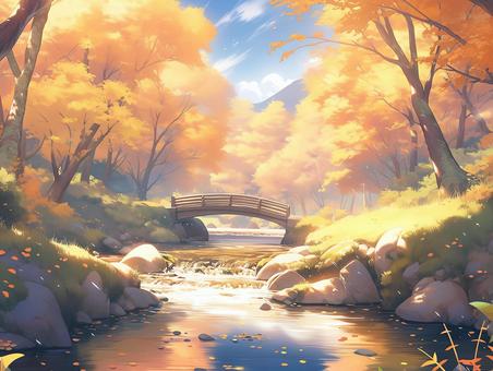 秋の川にかかる木の橋と黄葉する樹々_背景