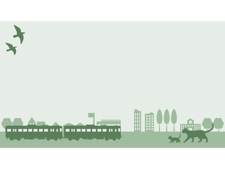 電車と猫シルエット背景 16:9・緑系