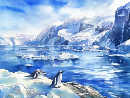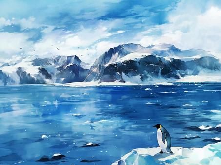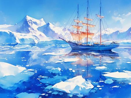 氷山と流氷の海に浮かぶ帆船のイラスト。