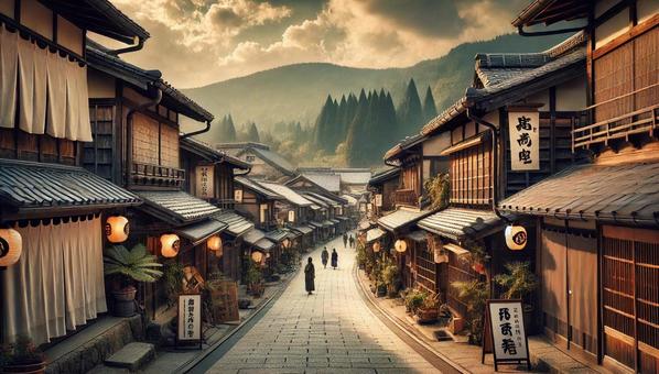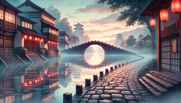 水鏡に映る黄昏時の古都の和風建築_背景画