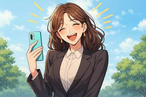 スマホを見て笑顔で喜ぶビジネスウーマン2