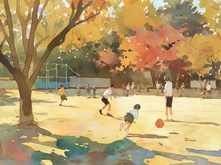 秋めいてきた学校のグラウンドで遊ぶ子供。