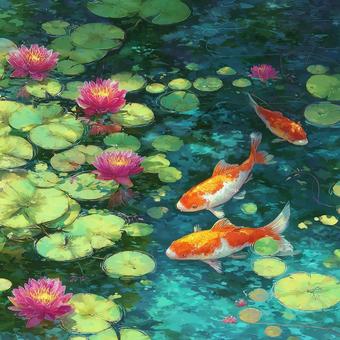 色鮮やかな睡蓮と錦鯉が泳ぐ静かな池