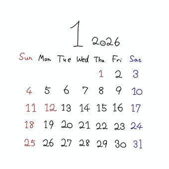 2026年1月カレンダー日曜始まり