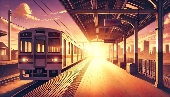 朝陽に照らされる駅のホームと電車_背景画