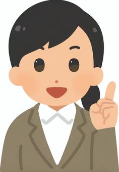 人差し指を立てるスーツ姿の女性