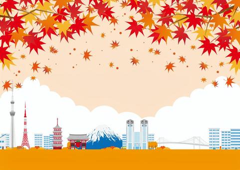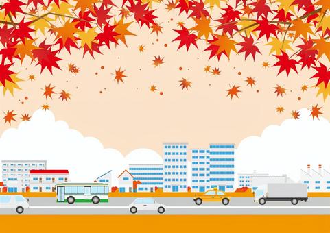 秋の紅葉と夕暮れの日本の街のイラスト風景