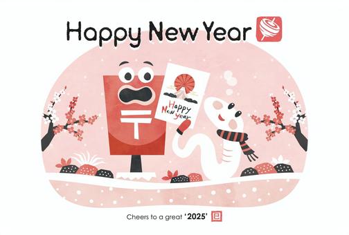 年賀状(2025)巳と郵便ポスト_ピンク