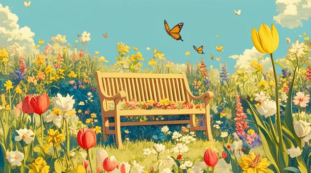 晴れた日の春の花畑とベンチ