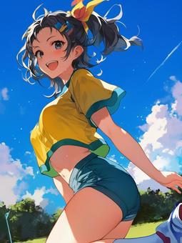 青空の下、元気に走るアニメ風の女の子