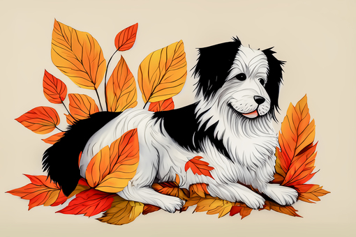 秋のオレンジの葉と可愛い大型犬のイラスト