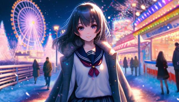 雪の遊園地で微笑む女子高生