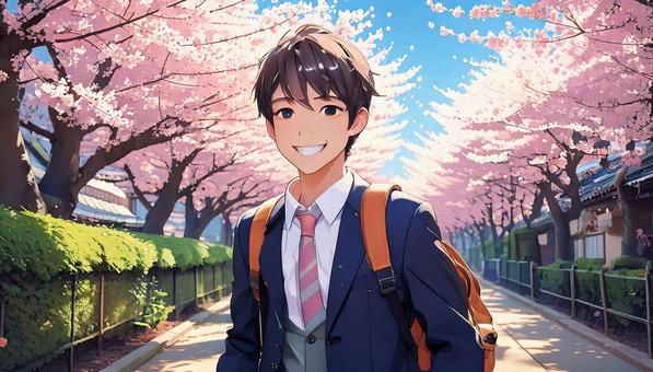 桜並木を歩く男子高校生