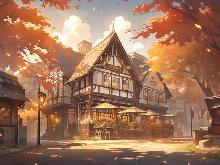 秋のレトロな街並みとオープンカフェ_背景