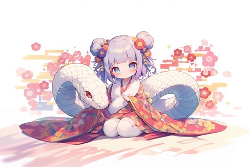 赤やピンクの着物を着て髪飾りを付けたヘビ