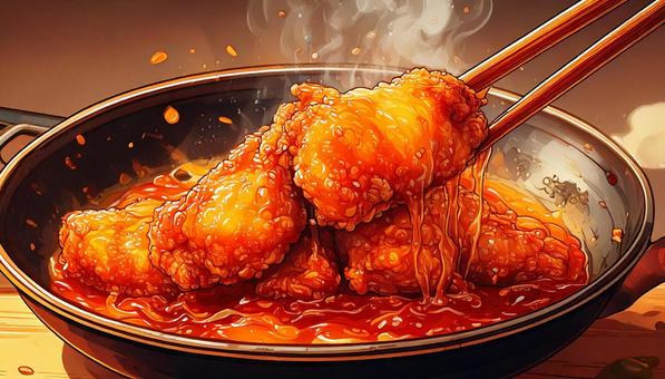 油で揚げているフライドチキン 箸あげ