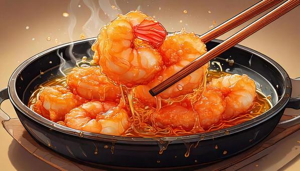 油で揚げている海老の素揚げ 箸あげ