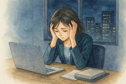 残業が終わらずに頭を抱える女性