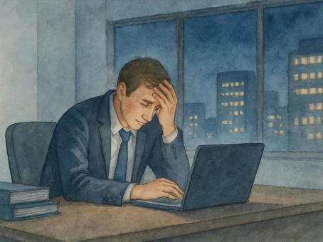 深夜のオフィスで頭を抱える男性