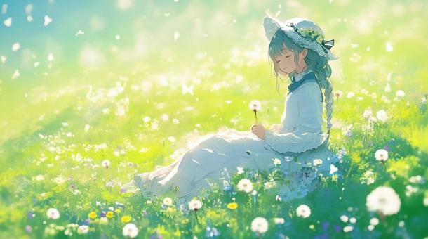 春の草原に座る女の子