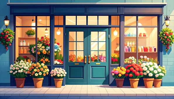 華やかな花々に彩られた花屋の入り口_背景