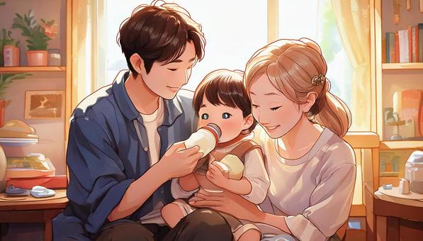 哺乳瓶から子供にミルクを飲ませる夫婦
