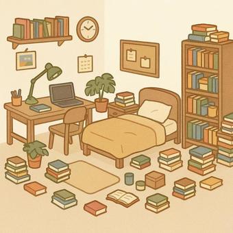 本や雑貨に溢れた机とベッドのある部屋