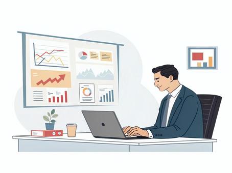 ノートパソコンでグラフを作成する男性