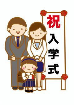 女の子と両親の小学校入学式